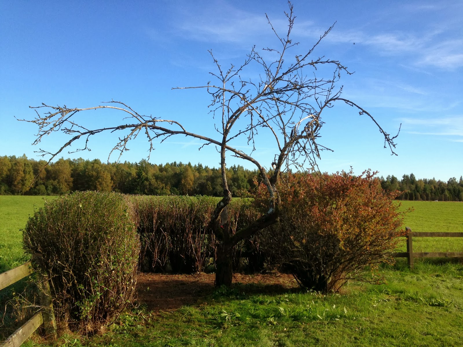 Med hjälp från en lätt förkyld Alva kunde vi frisera ner buskaget så att det faktiskt återfick något av sin forna glans! Och äppelträdet - ja, det får faktiskt stå kvar. Kanske ska tukta det lite när andan faller på, och kanske plantera en klematis intill som kan klättra i de döda grenarna! Krusbärsbusken ska få en glesning så småningom - just nu har jag inte hunnit...